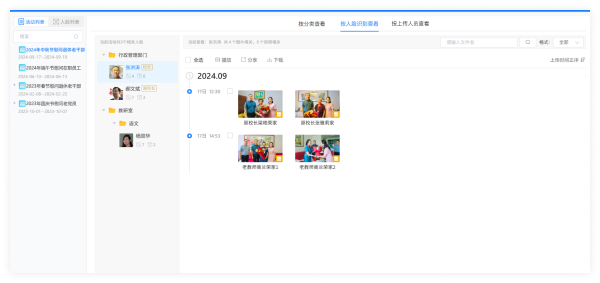 在整个单位中,按组织机构呈现,可以找到具体一个人在单位工作中、活动中的所有相关的媒体内容,并按时间轴交叉展示活动内容。